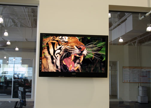 The secure mounted flat panel with concealed satellite receiver at the Toyota Dealership.