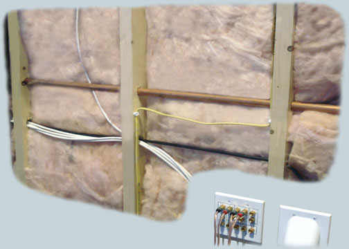 This image demonstrates how we run the wires when the house/basement is unfinished and it is the most ideal and clean installation scenario. Although, we're equiped and dealt with installations of all shapes and sizes we always recommend to our customers to plan for and have clear idea of what they want their TV/Home Theatre Room to be like and then call to us to prewire it before putting up the walls. Otherwise it may not be possible or will be more expensive to fully realize your vision.