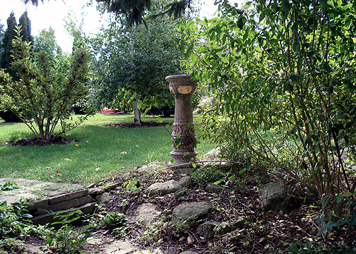 The wiring of numerous outdoor speakers in a garden.