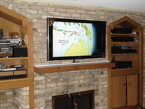 A secure mounted TV panel on the brick right above a natural fireplace with two sources including cable box and Blu-Ray player and surround sound. To hide the wires special stylized paintable tracks were used along the mantel and brick.