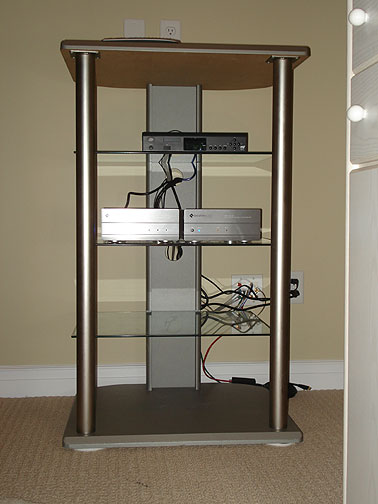 The cable box and multi zone receivers are connected and configured on customer's temporary shelving.