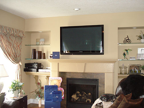 The flat panel secure mounted over a gas fireplace with wires concealed and run to euipment stored on a shelf to the left.