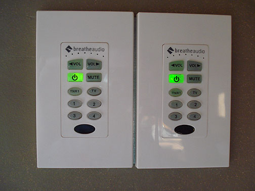 On wall control panels used to adjust speaker volumes, turn speakers on/off, and switch between different audio sources.