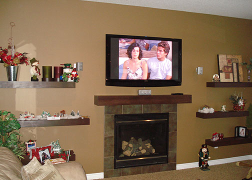 The flat panel is secure mounted over a gas fireplace with concealed wiring. All the equipment which includes cable box, two receivers (one for surround sound and additional for multi room audio) and DVD are wired in the basement for complete discretion. A special infrared sensor has been attached below TV for seamless Harmony remote control of hidden equipment.